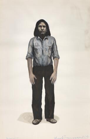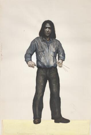 Kurt Trampedach: Selvportræt, stående. Sign. Kurt Trampedach 74. Mixed media på papir. Bladstørrelse 200 x 131. Uindrammet.