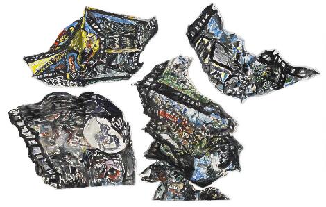 Malcolm Morley: Uden titel. Usign. Komposition i fire dele. Akvarel, gouache, tusch og blyant på papir. (4)