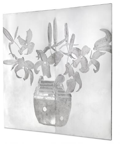 Erik A. Frandsen: Blomster i vase. Sign. EAF 2005-4 på begge sider. To-delt Relief af højglanspoleret stål. Samlet 260 x 260.