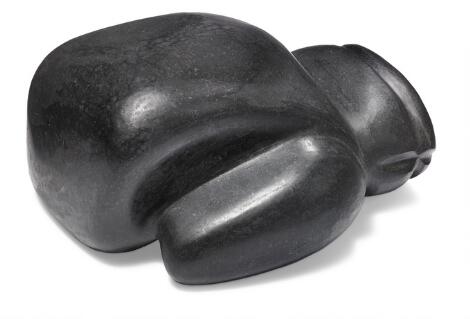 Poul Isbak: Boksehandske. Sign. P.I. 98. Sort granit. H. 14. B. 29. D. 20