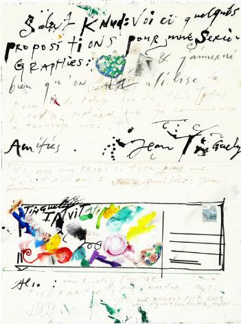 Jean Tinguely: Komposition. Sign. Jean Tinguely. Mixed media og collage på papir. Bladstørrelse 48 x 36.