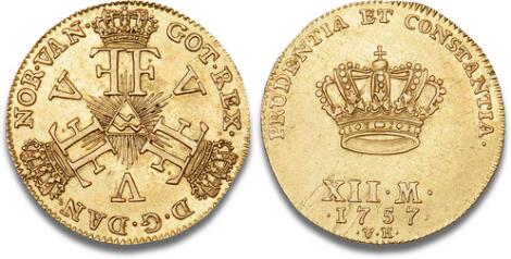 901/282Kurantdukat / 12 mark 1757 VH "stråledukat", H 24A, S 4, F 278, 3,10 g - ualmindelig variant
