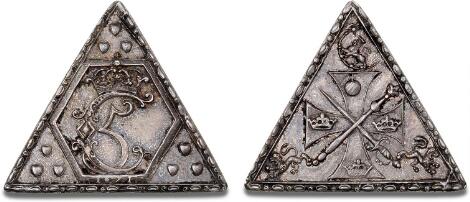 901/2741/6 speciedaler 1671, Ag, G 199, Sieg 152, fint tonet eksemplar af denne ualmindelige trekantede kastemønt fra kongens salving