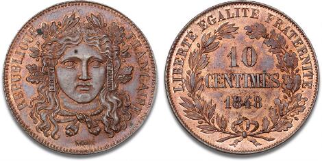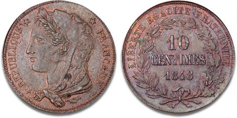 901/289Frankrig, prøvemønt præget på Christian VII, skilling 1771, H 37, 10 Centimes 1848, prøvemønt, Moullé, G. 234b, dele af C7's monogram er synlig på reversen