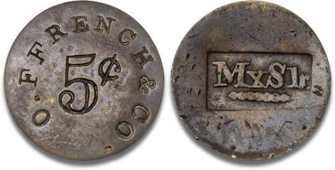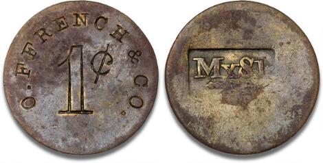 901/309O. Ffrench & Co., 1 Cent ND, Sieg 18, Higgie 419, JS 4606, reversen med 'MxSlr' (Mexican silver)