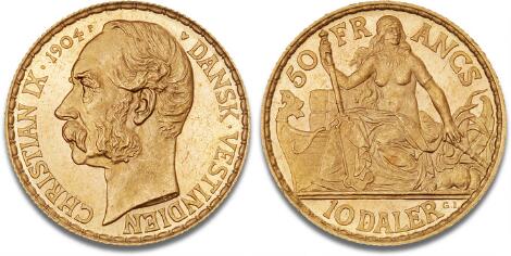 901/305Christian IX, 50 Francs / 10 Daler 1904, H 29, S 5, Sieg 32, F 1, KM 73 - exceptionelt eksemplar
