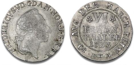 901/284Oldenborg, 1/6 Thaler 1763 B / IHM, cf. H 4D, S -, Sieg 55.4, J 18C, K/T 335 - usædvanlig fint eksemplar af ekstremt sjælden type