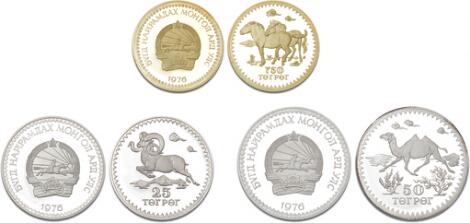 901/379Set with 750 Tugrik 1976, KM 38, Wildlife Conservation series, “Przewalski Horses” - only 374 Proofs minted, together with 25 and 50 Tugrik 1976, KM 36, 37
