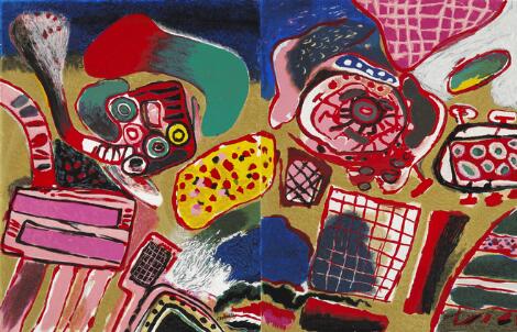 Corneille: Untitled. Signed Corneille, E.A. Terragraph in colours on canvas; two-parts. Each 144 x 110 cm. Overall 144 x 220 cm. Unframed. (2)
