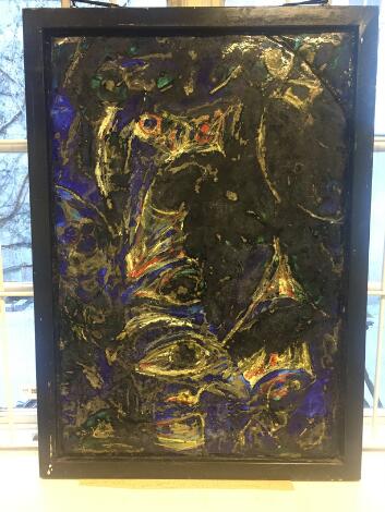 Carl-Henning Pedersen: Untitled. Signed chp 1995. Glass mosaique mounted in an iron frame. 100 x 70 cm.
