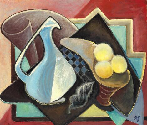 Orla Muff: Still life with pitcher and fruit. Signed Muff. Oil on canvas. 50 x 60 cm.
