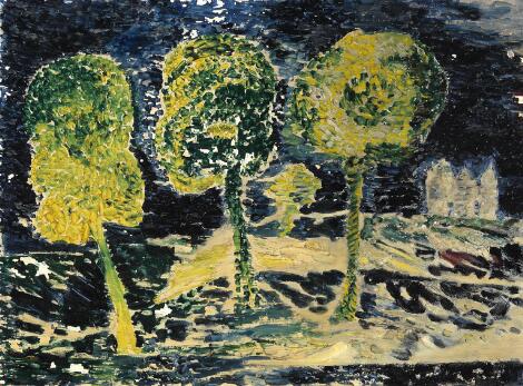 Carl-Henning Pedersen: "Det hvide hus", Ræveskiftet, 1956. Signed, titled and dated on the reverse. Oil on masonite. 48 x 61 cm.