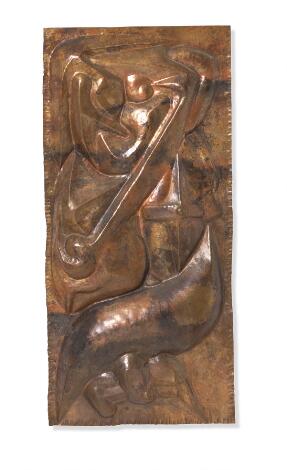 Stanislas Wojcieszynski, dit Wostan: "Dieu Pan", 1961. Signed on the reverse Wostan. Hammered copper. Relief. 78 x 37 cm.