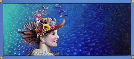 Niels Erik Skovballe: "Margrethe fra Amalienborg" (Margrethe from Amalienborg). Signed monogram 2011. Oil on board. 66 x 144 cm.