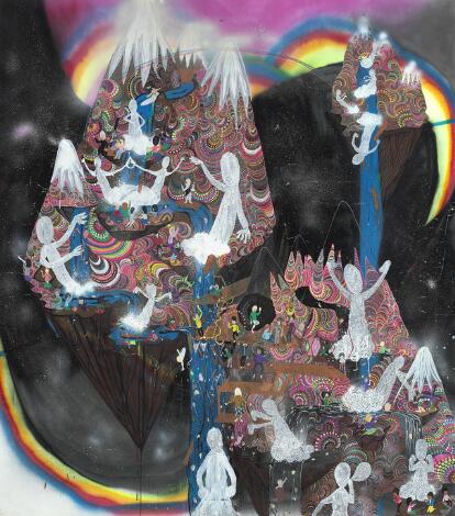 Christian Finne: Untitled. Psychedelic composition. Unsigned. Mixed media on paper laid down on canvas. 260 x 230 cm. Unframed.