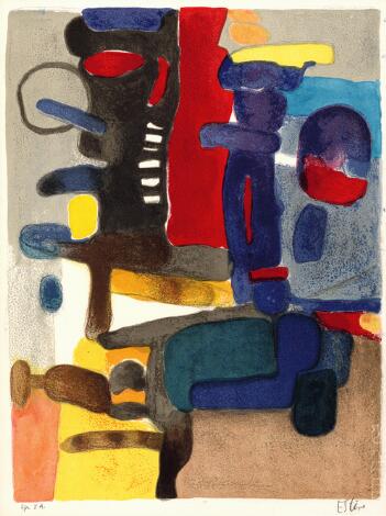 Maurice Estève: "Guidour", 1962. Signed Estève, Ep. d'A. Lithograph with hand colouring. Sheet size 34 x 26 cm. Unframed.