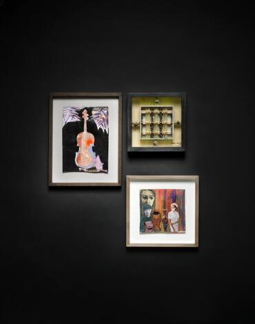 Torben Hardenberg: "Zulu Awards". A composition with figures made of bone, and two collages. Visible size 22 x 22 cm. 20 x 20 cm. and 21 x 29 cm.