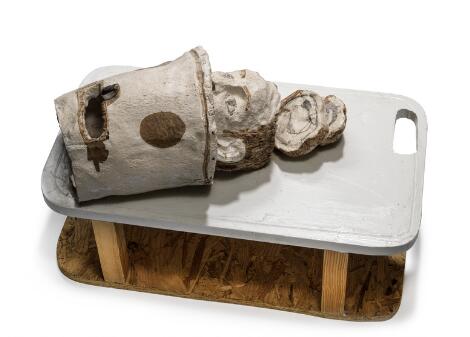 Alexander Tovborg: "Everyone become heroes", 2007. Signed, titled and dated on the base. Wood and ceramic. H. 30 cm. W. 54 cm. D. 30 cm.