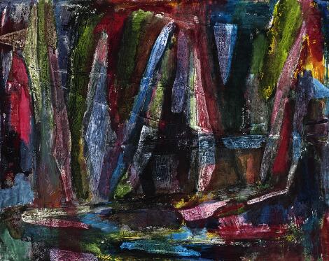 Carl-Henning Pedersen: "Fantasi landskab", Ræveskiftet 1956. Signed, titled and dated on the reverse. Oil on masonite. 45 x 61 cm.