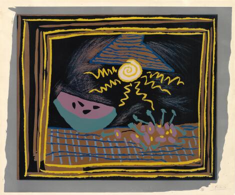 Pablo Picasso: "Nature Morte a la Pastèque", 1962. Sign. Picasso, 113/160. Linoleumssnit i farver. Bladstørrelse 62 x 75.