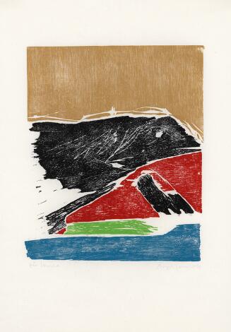 Asger Jorn: "Im Vogeltal". Sign. Asger Jorn 64-70, für Ursula. Træsnit i fem farver. Bladstørrelse 61 x 43.