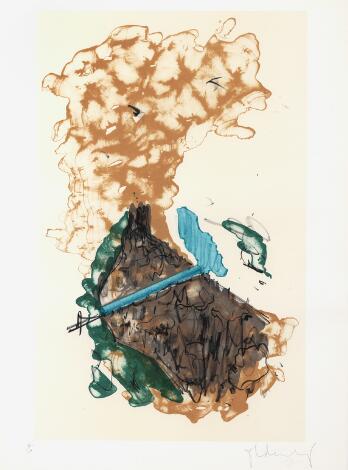 Claes Oldenburg: "Proposal for a Broome Street Expressway in Form of a Cigarette and Smoke", 1973. Lithograph in colours. Sheet size 76 x 56 cm.