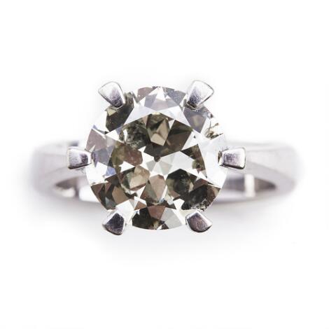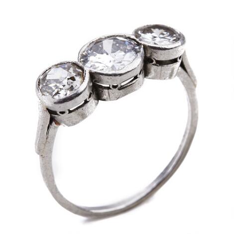 A diamond ring set with three old-cut diamonds weighing a total of app. 2.75 ct., mounted in 18k white gold. Size 54. Circa 1900.