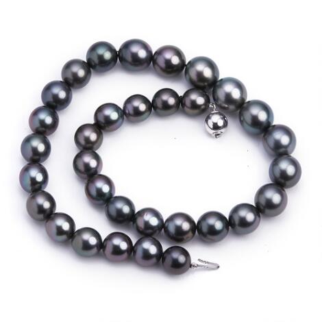 A Tahiti pearl necklace set with numerous cultured Tahiti pearls and a clasp of 18k white gold. Pearl diam. app. 12.0-14.9 mm. L. app. 46.5 cm.
