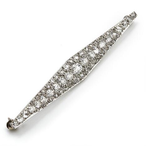 An Art Deco diamond brooch set with numerous old and rose-cut diamonds weighing a total of app. 2.50 ct., mounted in platinum. L. app. 7.5 cm. Circa 1930.