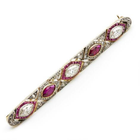 A ruby and diamond brooch set with natural marquise-cut Burma rubies, old and rose-cut diamonds, and square-cut tourmalines, mounted in platinum and gold.