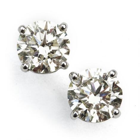 A pair of diamond ear studs each set with a brilliant-cut diamond weighing a total of app. 4.04 ct., mounted in 18k white gold. K/VS-SI.