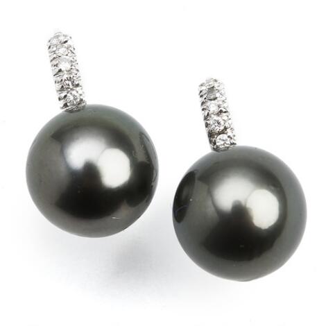 A pair of Tahiti pearl and diamond ear pendants each set with a cultured Tahiti pearl and brilliant-cut diamonds, mounted in 18k white gold. L. app. 2 cm.