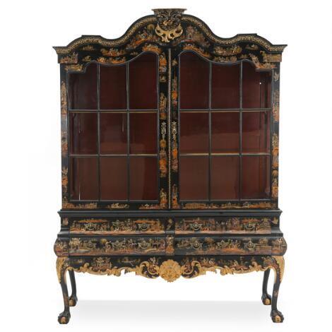 A large Dutch Japanned Rococo display cabinet with two sash bar doors and four drawers. Ca. 1760-1780. H. 225 cm. W. 170 cm. D. 56 cm.