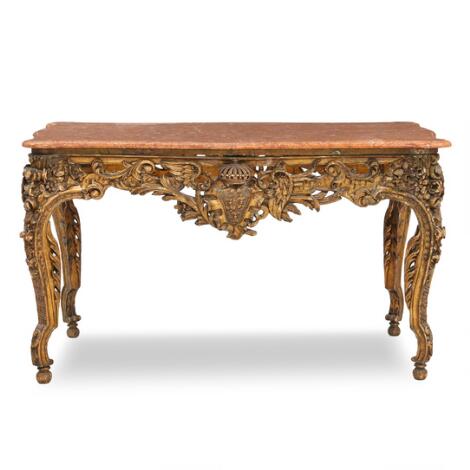A richly carved Italian Rococo style giltwood center table with the coat of arms of the House of Bourbon. Marble top. Ca. 1870. H. 77 cm. W. 132 cm. D. 82 cm.