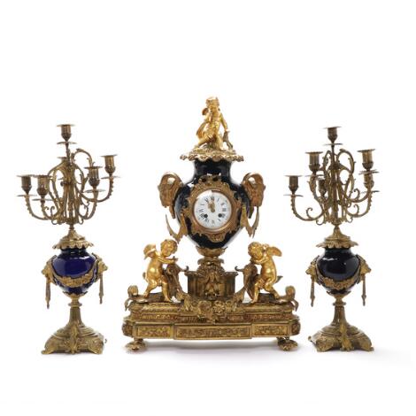A French Louis XVI style bronze and 'Bleu de Roi' porcelain three-piece mantel set. Late 19th century. (3)