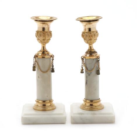 Et par gustavianske lysestager af forgyldt bronze og gråbroget marmor. 18. årh. H. 17 cm. (2)