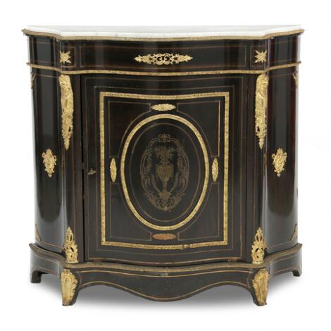 An ebony veneered Napoleon III credenza with brass inlays and gilt-bronze mountings. Marble top. France, ca. 1870. H. 107 cm. W. 114 cm. D. 44.