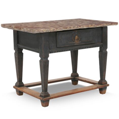A Swedish stone top table, the top of Öland limestone, lower part of black painted wood, front with one drawer. 19th century. H. 80 cm. W. 109 cm. D. 66 cm.