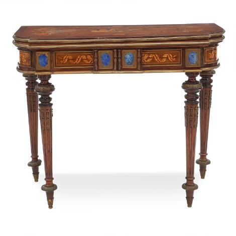 A richly inlaid Russian Louis XVI style walnut and fruitwood card table. Frame with six lapis lazuli panels. Ca. 1870. H. 75 cm. W. 91 cm. D. 45/90 cm.
