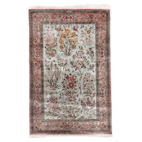 A signed Qum full silk rug, Persia. C. 900.000 kn. pr. sqm. C. 2000. 162 x 104 cm.