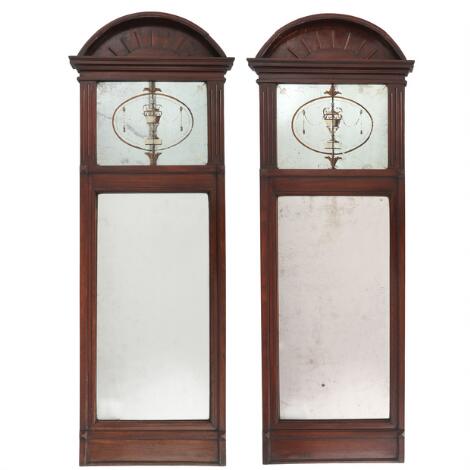 A pair of early Danish Empire mahogany mirrors with two-piece mirror glasses; upper mirror with painted decoration. Ca. 1800. H. 135 cm. W. 49 cm. (2).