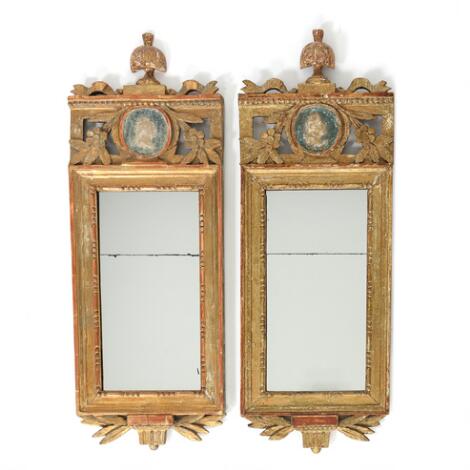 A pair of Gustavian giltwood mirrors with profile heads. Unsigned. Sweden, late 18th century. H. 82 cm. W. 30 cm. (2).