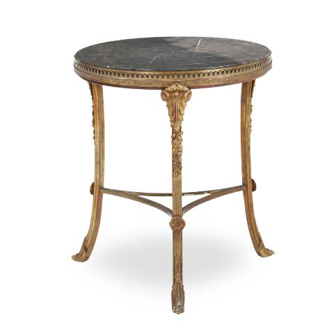 A small French bronze occasional table or guéridon with greyish marble top. Louis XVI style, ca.- 1920. H. 49 cm. Diam. 42 cm.