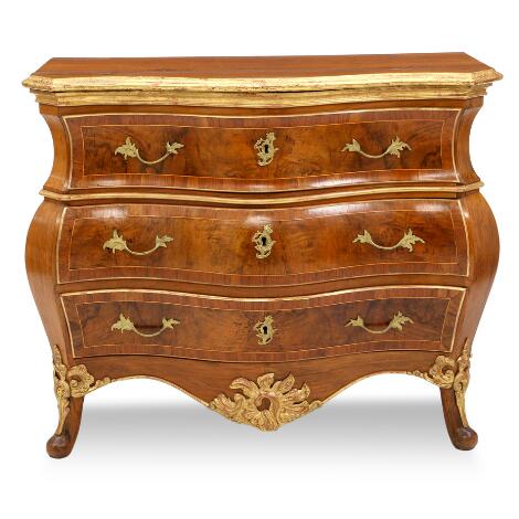 A large Danish Rococo walnut and giltwood commode. Ca. 1760. H. 104 cm. W. 124 cm. D. 60 cm.