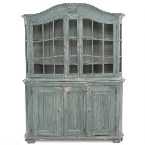 A large blue painted vitrine cupboard. Slesvig-Holstein, 18th century. H. 235 cm. W. 177 cm. D. 56 cm.