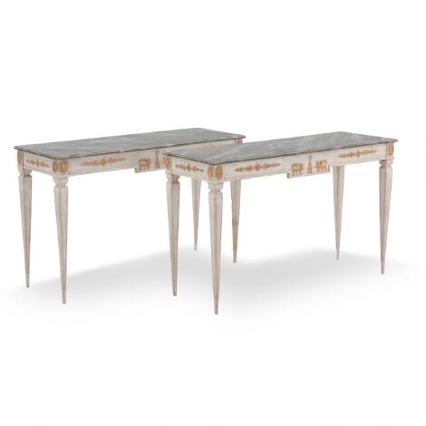 A pair of painted and partially gilded Swedish console tables. Gustavian style. H. 82 cm. W. 135 cm. D. 46 cm. (2).