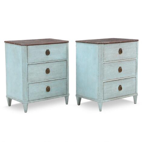 A pair of Gustavians style blue painted and 'faux' marble commodes, each with three fluted drawers. 20th century. H. 80 cm. W. 66 cm. D. 45 cm. (2)