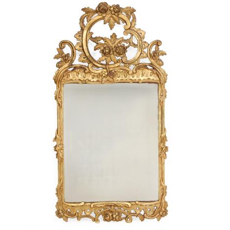 A richly carved and gilded Danish Rococo mirror. Ca. 1760. H. 118 cm. W. 60 cm.