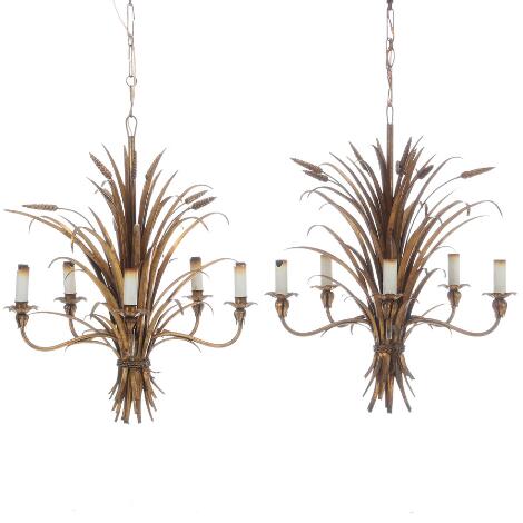 A pair of sheaf shaped five light French chandeliers of gilded metal, made for electricity. 20th century.H. 70 cm. Diam. 57 cm. (2)