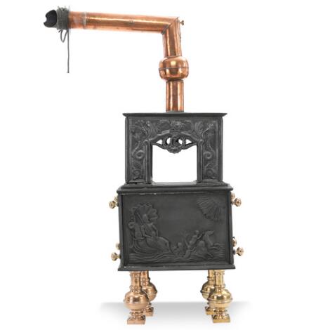 A Norwegian two-storey cast iron stove. After Henrik Bech. Fossum, ca. 1767. H. 216 cm. W. 82 cm. D. 45 cm.